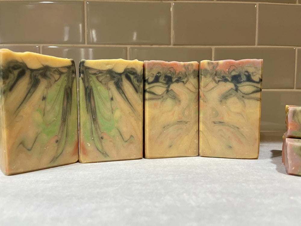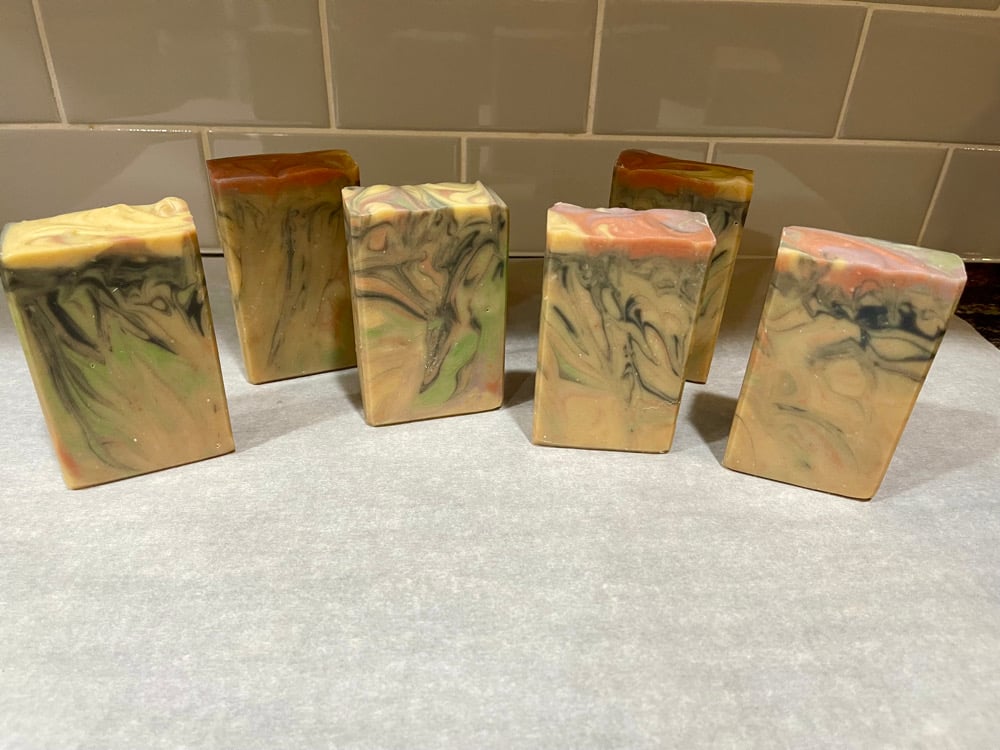 Since my products are all handmade, hand-poured, and hand-cut no two bars of soaps will look exactly the same. As colors, patterns, and shape can and do vary from batch to batch, please expect differences in my designs from time to time.